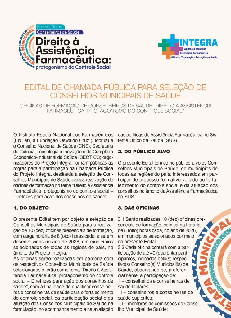 O INTEGRA é um projeto de Formação de Lideranças e mobilização social, promovido pelo Instituto Escola Nacional dos Farmacêuticos (ENFar), pela Fundação Oswaldo Cruz (Fiocruz), pelo Conselho Nacional de Saúde (CNS), pela Secretaria de Ciência, Tecnologia e Inovação e do Complexo Econômico-Industrial da Saúde – SECTICS e conta com o apoio da Federação Nacional dos Farmacêuticos (Fenafar) e da Organização Pan-Americana da Saúde (OPAS).